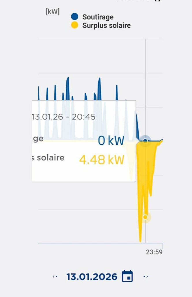 Ci dessous un graphique d’un de mes onduleurs, logiciel Huawei mise à jour régulièrement. Je sais bien que le Groupe E n’a pas d’accès à la production solaire de mes panneaux, mais la tache jaune du surplus (en kW et non en kWh) est totalement stérile et donne un fausse impression de gain quelconque (kWh donc Frs).